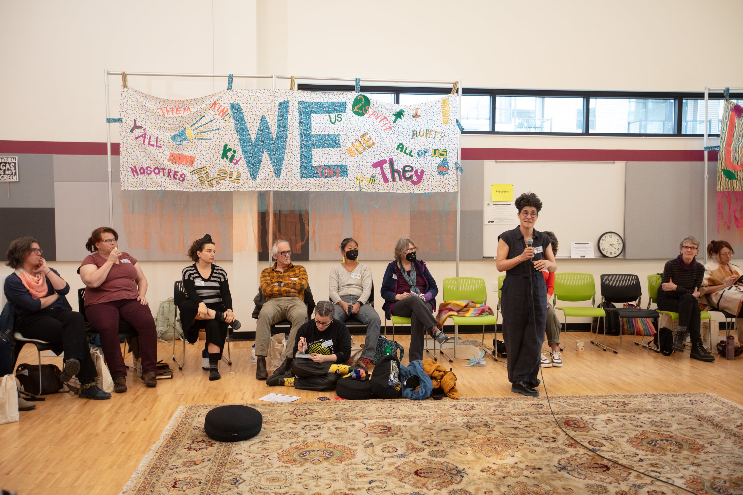 The workshop provides attendees with practical ways to co-design slogans and work with reusable materials to create banners while listening to speakers and experts who have spent their lifetime organising, creating movements, resisting and practically creating change through the power of the individual and also within groups. The workshop is a space of knowledge sharing and ways for everyone to engage in learning and making together.